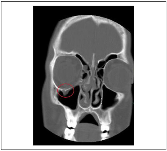 In addition to muscle entrapment, many other types of periorbital and globe injuries were diagnosed in our pediatric cohort. Complex eyelid lacerations were requiring operative intervention occurred in seven patients, with two of these patients requiring canthal repositioning. There were five cases of lacrimal/canalicular injury, five cases of traumatic optic neuropathy, and three cases of hyphema. Two patients had ruptured globe requiring enucleation. One patient had direct injury to the optic nerve by gunshot wound to the orbit penetrating the optic canal (Figure 3).