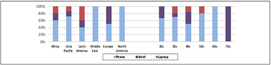 We asked 26 interviewees about their use of “gadgets” to access online surgical resources. Seventeen participants (65%) preferred using their smartphone, while 4 (15%) preferred using a laptop, and 5 (19%) said they used both phones and laptops equally. Among those who were not specifically asked about gadget preferences, the desire for a system that was compatible across platforms (mobile, tablet, desktop—but with most emphasis on mobile/tablet capabilities) was commonly cited. We observed regional trends in gadget preferences, with heavier laptop usage (combined or not) in Latin America, Africa, and Europe compared to Asia. Figure 1 (left) and (right) provides more information about gadget trends by region and age.