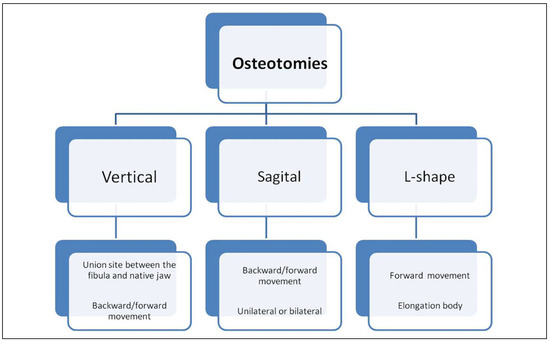 Sagittal osteotomies allow backward and forward movement through sliding, increasing contact between surfaces and maximizing bone stability, repositioning the bone segments and improving the facial symmetry. [2,7] Vertical osteotomies can also be performed, removing or not the plate placed in the union site between the fibula and the mandible. [4] L-shaped osteotomies are performed parallel to the vector of movement, adding 1 cm when possible to increase the contact surface, improving stability. [7]