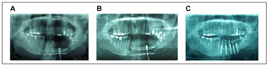 The patients who had a deficit of bone tissue in a vertical or transverse plane, underwent osteogenic distraction in order to correct either the length or width of the bone, respectively. Once an adequate bone measure was achieved and the distractor was removed, these patients underwent placement of osseointegrated implants (Figure 2) at a later stage after their rehabilitation.