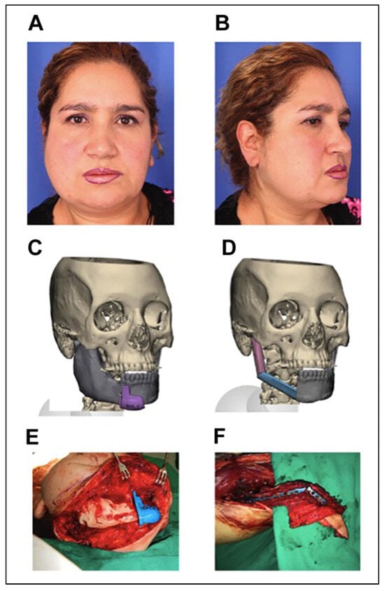 Patient with mandibular ameloblastoma underwent right hemimandibulectomy and reconstruction with a free fibula flap guided with 3-dimensional planning, which was erroneously designed for the contralateral fibula, leaving the patient with postoperative malocclusion; (A,B). preoperative clinical pictures, (C,D). computer-guided surgical planning, (E). Cutting guide in place for tumor resection (F). Mandibular reconstruction with a free fibula flap.