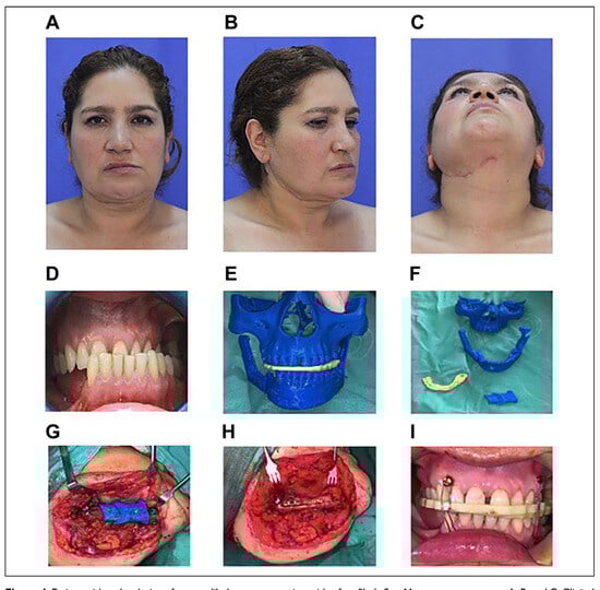 Patient with malocclusion after mandibular reconstruction with a free fibula flap. Management sequence: (A–C). Clinical pictures with malocclusion. (D). Intraoral picture with the resultant malocclusal bite. (E,F). Preoperative planning cutting guide and occlusal splints. (G). Cutting guide is placed for L mandibular osteotomy, in the axial plane. (H). Intermaxillary fixation, bone segments reduction and fixation with miniplates. (I). Final occlusal state after orthognathic surgery.