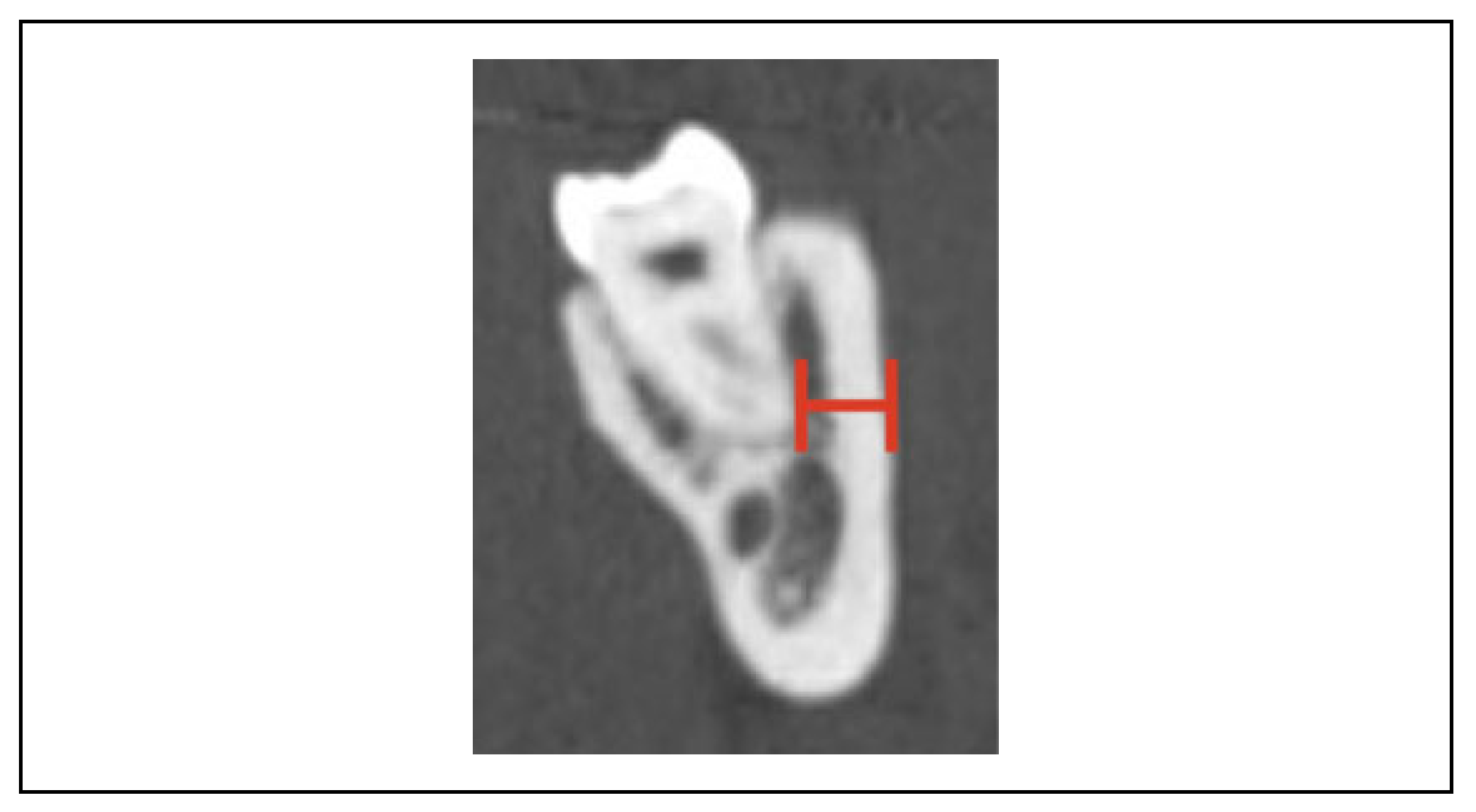 - Fernandes, A.C.; Rossi, M.A.; Schaffner, I.S.; Machado, L.A.; Sampaio, A.A. Lateral cortical bone thickness of human mandibles in region of mental foramen. J. Oral. Maxillofac. Surg. 2010, 68, 2980–2985. [Google Scholar] [CrossRef] [PubMed]