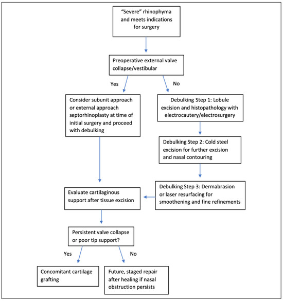 Authors’ proposed algorithm for the surgical approach to a patient with “severe” rhinophyma. For the surgical treatment of severe rhinophyma, we recommend using a combined, ordered approach.
