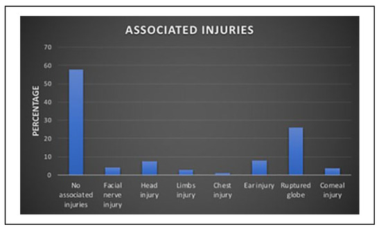 Ocular injuries comprising ruptured globe which makes up of 25 (14.5%) cases and corneal injuries making up of 6 (3.5%) cases, were the most commonly associated injuries.