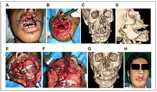 A. Photograph of a gunshot victim showing a substantial part of the upper lip shaved off by the bullet and transpalatal wire used to stabilize the maxillary fracture. B. Photograph of the same patient showing an extensive horizontal split of the tongue. Note the skin sutures used initially to repair facial laceration during stage 2 of the damage control surgery (DCS) for the patient. C. Oblique view of a preoperative 3-D CT Scan of the patient showing comminuted fractures of symphysis, right body and angle of mandible, comminuted fracture of right maxilla with missing part of anterior and left maxilla. D. Lateral view of 3-D CT scan showing displaced fracture of right angle of mandible. Note the presence of oro-tracheal intubation. E. Intraoperative photograph showing ORIF of the fractures of the mandible during stage 4 of DCS. F. Intraoperative photograph showing ORIF of the fractures of the maxilla. G. Anteroposterior view of postoperative 3-D CT scan showing ORIF of the fractures of mandible and maxilla. H. Photograph of the patient take 4 weeks postoperatively showing healed facial lacerations and deformation of upper lip which will require correction at a later stage.