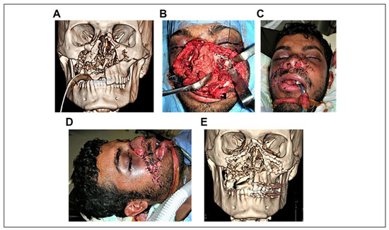 A. Anteroposterior view of 3-D CT scan of a patient with comminuted fracture of maxilla and nose following gunshot injury to the midface. B. Intraoperative photo of the patient showing extensive facial laceration with degloved nose and ORIF of the maxillary fracture during early definitive surgery of his injuries. C and D. Postoperative photos of the patient showing satisfactory repair of facial lacerations after ORIF of the maxillary and nasal fractures. E. Postoperative anteroposterior 3-D CT scan showing ORIF of the maxillary and nasal fractures.