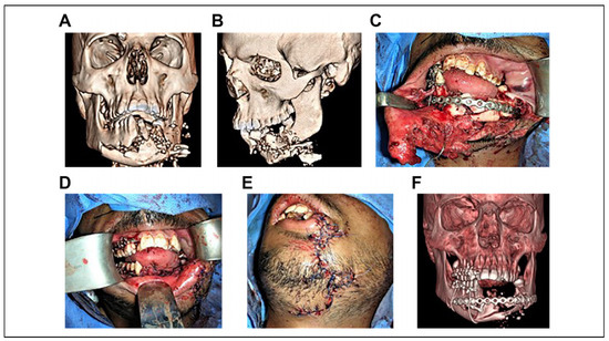 A. Anteroposterior view of preoperative 3-D CT scan showing comminuted fracture of mandible resulting from gunshot injuries. B. Lateral view of preoperative 3-D CT scan showing comminuted fracture of mandible. C. Intraoperative photo showing alignment of comminuted fractures of mandible with bony fragments aligned and fixed with wires and reinforced with reconstruction plate. Note the extensive laceration of the lower lip extending the chin. D. Intraoperative photo showing closure of the wound after ORIF of the fractures. E. Intraoperative photo showing closure of the wound involving the lower lip, mental and submental region after ORIF of the fractures. F. Anteroposterior view of postoperative 3-D CT scan showing ORIF of the comminuted fractures of mandible with some bone fragments supported with circum-mandibular wires.