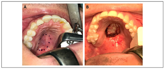 A. Marking of defect prior resection, B. Surgical defect after resection of tumor.