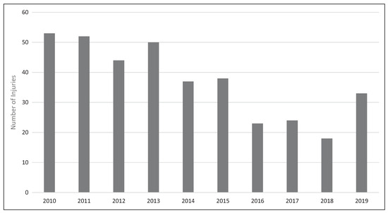 A total of 361 skiing and snowboarding-related primary facial injuries were recorded in the ED during the 10-year study period. Sixty-eight percent (244/361) of these injuries occurred in male patients, and the mean (+ standard deviation [SD]) age was 21.1 (+ 14.5) years. The most common race to suffer facial injuries was white (259/361; 71.7%). The most common injury diagnosis was laceration (165/361; 45.7%). The most common disposition from the ED was treated and discharged (340/361; 94.2%). Full demographic data are described in Table 1. The inci- dence of facial injuries steadily declined from 53 to 18 between 2010 and 2018 before increasing again to 33 in 2019 (Figure 1). Over this study period, the head: face injury ratio was 6:1.