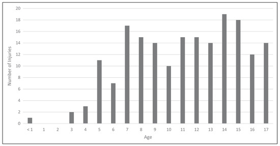 Of the total primary facial fractures recorded, all had age recorded. The youngest patient was 11 months old and the oldest patient was 80 years old. Pediatric patients (age < 18 years) accounted for 52% of recorded injuries (187/361) and had mean (SD) age of 11.1 (3.8) years. The most common age of injury (n ¼ 19) was 14 years (Figure 2). Children had a higher incidence of lacerations (51.9% vs 39.1%, P < 0.05), and adults had higher incidence of fracture (30% vs 13.9%, P < 0.001). Additionally, after being seen in the ED, children were more likely to be admitted than adults (4.8% vs 1.15%, P < 0.05). There was a reported on-scene or ED fatality rate of 0% (Table 2).
