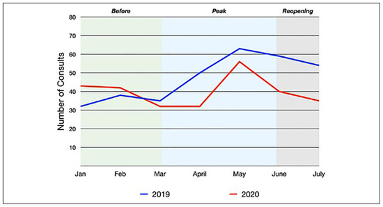 Number of consults each month for 2019 and 2020. The before, peak, and reopening subgroup periods are represented by the shaded background colors.