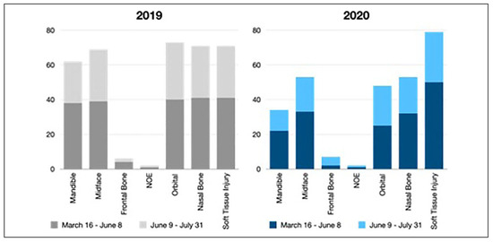 Following approval from the Cooper University Health Care Institutional Review Board Committee (#20-480), the investigators designed a retrospective analysis of our institution’s prospectively maintained trauma registry. The study population was composed of all patients who received a consultation for facial trauma evaluation from January 1, 2019 to July 31, 2019 and January 1, 2020 to July 31, 2020. Each subject’s electronic medical records were independently reviewed and data was extracted into a secure study database.