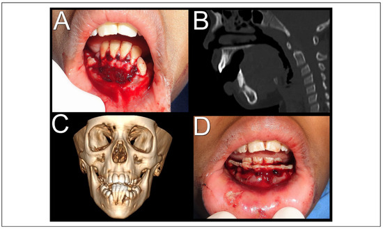 - Kale, T.P.; Urologin, S.B.; Kapoor, A.; Lingaraj, J.B.; Kotrashetti, S.M. Open cap splint with circummandibular wiring for management of pediatric mandibular parasymphysis/symphysis fracture as a definitive treatment modality; a case series. Dent Traumatol. 2011, 29, 410–415. [Google Scholar] [CrossRef] [PubMed]