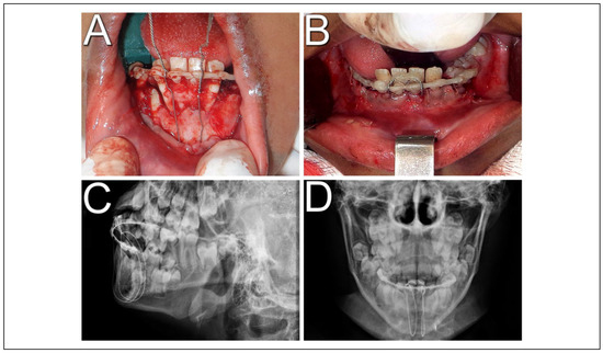 Surgical procedure. (A) Transoperative photograph showing dentoalveolar segment stabilization by a circummandibular wire associated with a new dental splint; (B) intraoral photography in immediate postoperative period; (C) postoperative skull radiography in lateral position; (D) postoperative skull radiograph in posteroanterior position.