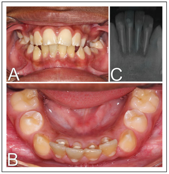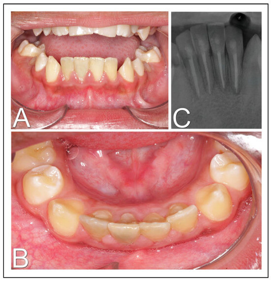 Three years and 6 months follow-up. (A) Intraoral photograph in front view; (B) intraoral photograph in upper view of lower incisors with definitive restorations; (C) periapical radiography with signs of bone formation and absence of periapical lesions.