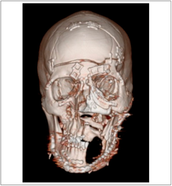 - Gravvanis, A.; Iconomou, T.; Tsoutsos, D.; Katsikeris, N. Aesthetic and anatomic subunit reconstruction of composite mandibular gunshot wound. J Craniofac Surg. 2012, 23, e95–e98. [Google Scholar] [CrossRef]