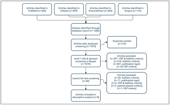 Our database search resulted in 305 articles from PubMed/ MEDLINE, 309 articles from Embase, 653 articles from ScienceDirect, and 115 articles from Scopus, which totaled 1382 articles. Following duplicate detection in Rayyan, 1070 articles remained. After title and abstract screening, 48 articles remained. Full text screening and article attrition yielded 8 articles for final inclusion and analysis (Figure 6). The 8 articles that adhered to our inclusion criteria are listed and described in Table 3.