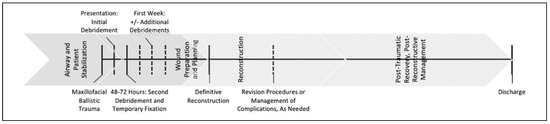Average clinical timeline. Maxillofacial ballistic trauma surgical management is typically partitioned into 3 phases: initial operative debridement and temporary stabilization, definitive soft tissue and/or bony reconstruction, and possible subsequent aesthetic refinement.