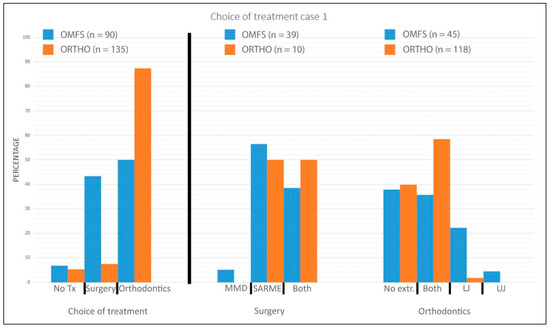 Choice of treatment case 1. LJ indicates premolar extractions in lower jaw; MMD, mandibular midline distraction; OMFS, oral and maxillofacial surgeons; ORTHO, orthodontists; SARME, surgically assisted rapid maxillary expansion; Tx, treatment; UJ, premolar extractions in upper jaw.