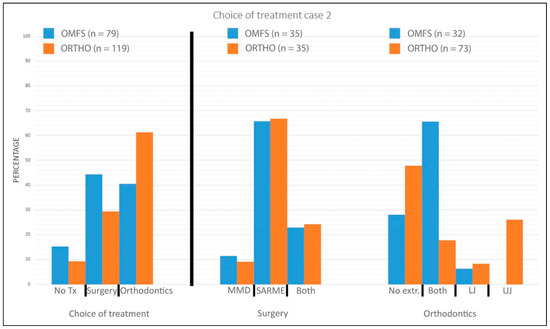 Choice of treatment case 2. LJ indicates premolar extractions in lower jaw; MMD, mandibular midline distraction; OMFS, oral and maxillofacial surgeons; ORTHO, orthodontists; SARME, surgically assisted rapid maxillary expansion; Tx, treatment; UJ, premolar extractions in upper jaw.