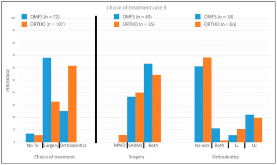 Choice of treatment case 3. LJ indicates premolar extractions in lower jaw; MMD, mandibular midline distraction; OMFS, oral and maxillofacial surgeons; ORTHO, orthodontists; SARME, surgically assisted rapid maxillary expansion; Tx, treatment; UJ, premolar extractions in upper jaw.