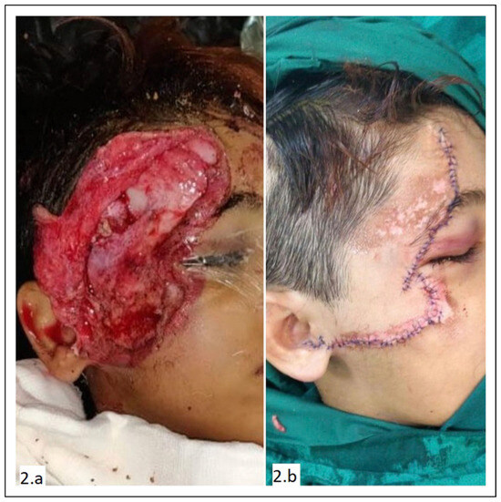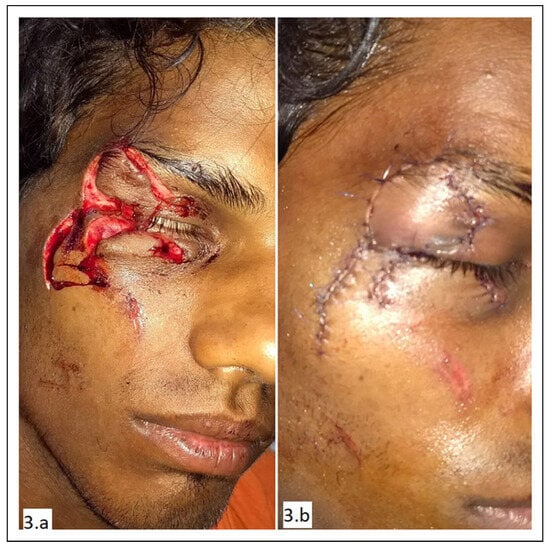 An eight-year-old boy presented to the emergency with a suspected head injury and large facial avulsion over the right upper face with exposed bone (Figure 2A). The child did not have any other major injury. On evaluation, head injury was ruled out. The child was taken to OR for repair of the facial injury (Figure 2B).