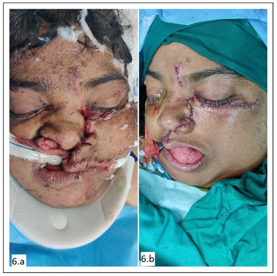 - Nasal bone fracture: Compound fracture of nasal bone was present but it was not amenable for any fixation. Therefore, it was managed conservatively by reduction of fragments, suturing of overlying skin, and splinting.