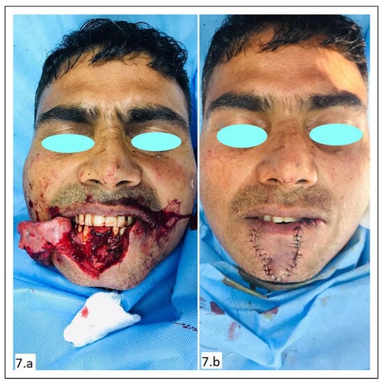 Thirty-year-old man was brought to emergency with near total avulsion of the lower lip (Figure 7A). Additional injury was ruled out.