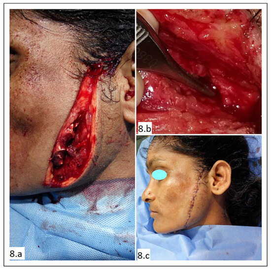 A 29-year-old lady presented with deep laceration over the left parotid region due to attack with a sharp object (Figure 8A). She did not have any other injury. She had mild weakness in puffing the left cheek. On exploration under local anesthesia, the parotid gland was found to be injured and a branch of the facial nerve was found transected (Figure 8B). The facial nerve was repaired under magnification using 9-0 nylon. The parotid capsule was repaired with 4-0 vicryl. The muscle was approximated with 4-0 vicryl, and the skin was repaired with 5-0 prolene (Figure 8C).