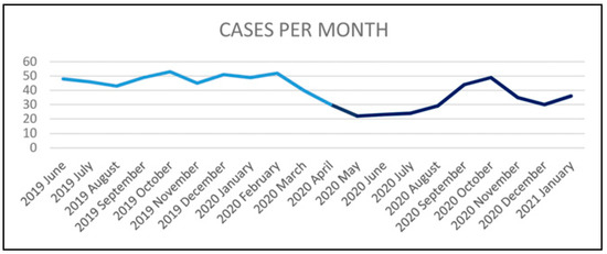 - Yeung, E.; Brandsma, D.S.; Karst, F.W.; Smith, C.; Fan, K.F. M. The influence of 2020 coronavirus lockdown on presentation of oral and maxillofacial trauma to a central London hospital. Br. J. Oral Maxillofac. Surg. 2021, 59, 102–105. [Google Scholar] [CrossRef]