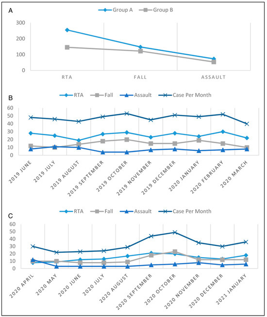 A total of 798 patients sought treatment in our outpatient department for maxillofacial hard tissue injury to mandible during the 20 month time period. This included 476 patients in Group A (1st June 2019 to 31st March 2020) and 322 in Group B (1st April 2020 to 31st January 2021). Both groups had similar mean age, that is, 27.67 ± 8.08 years and 26.25 ± 7.45 years, respectively. The data shows that there was obvious decrease in trauma related footfall after and during lock down due to pandemic (Figure 1). These cases showed a steep fall during first wave of pandemic, that is, initial months after lockdown and showed a gradual return to pre-pandemic times as of January 2021.