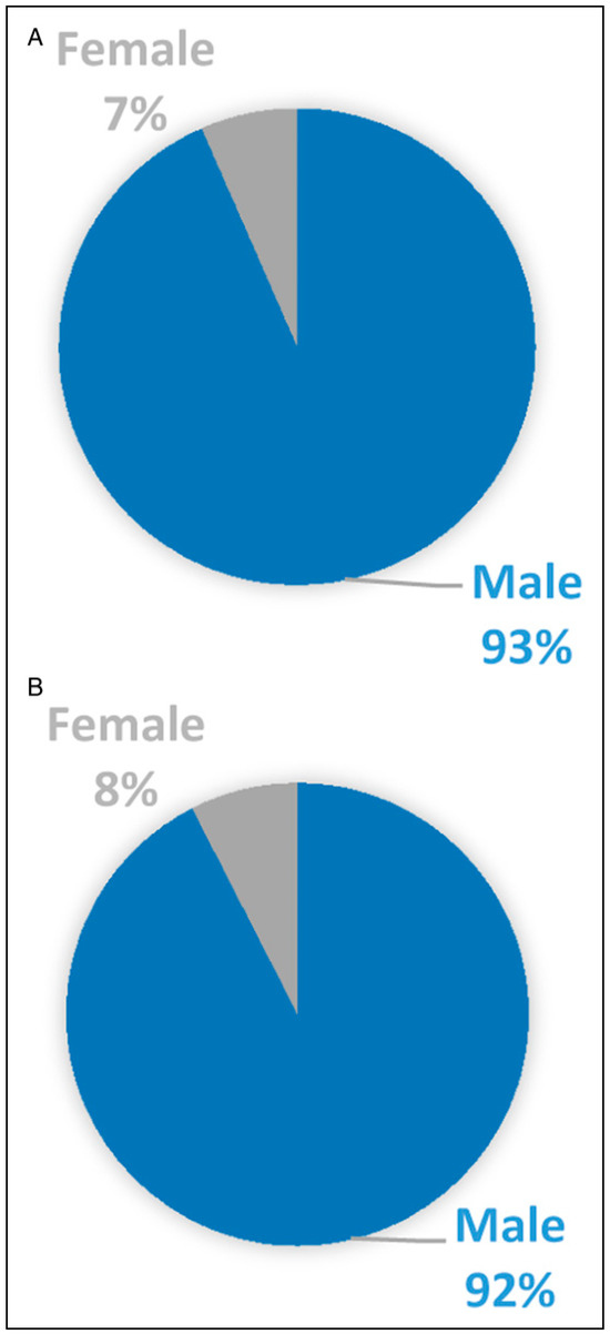 a. Comparison of number of Cases According to Gender in Group A. b. Comparison of number of Cases According to Gender in Group B.