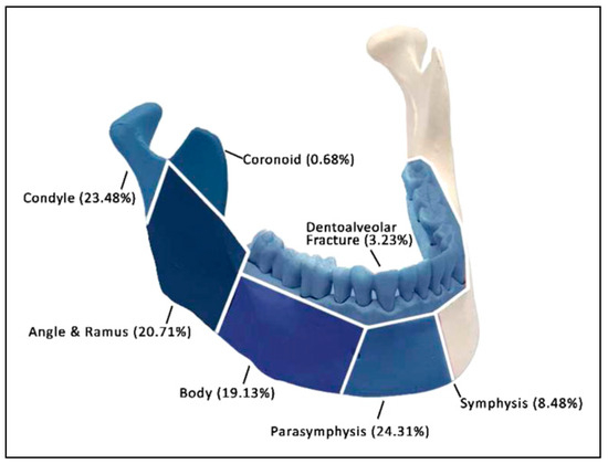 - Barde, D.; Madan, R.; Mudhol, A. Prevalence and pattern of mandibular fracture in Central India. Natl. J. Maxillofac. Surg. 2014, 5, 153–156. [Google Scholar] [CrossRef]