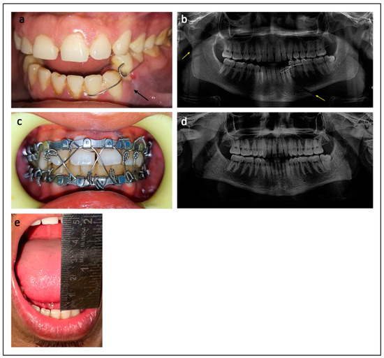 Mandibular fracture treated by Closed Reduction. a. Intraoral photograph showing fracture of mandible between left canine and first premolar; b. Orthopantomogram (OPG) showing displaced left parasymphysis and right subcondylar fractures; c. Intraoral photograph showing closed reduction with IMF using Erich arch bar; d. Postoperative OPG showing healed mandible; e. Postoperative photograph showing adequate mouth opening.