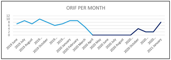 Comparison of month wise number of patients who underwent ORIF as treatment of mandibular fractures.