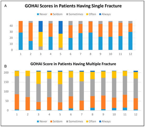 a. Distribution of frequency and percentage answers of the quality of life (GOHAI) of subjects with single mandible fractures (n = 48). b. Distribution of frequency and percentage answers of the quality of life (GOHAI) of subjects with multiple mandible fractures (n = 210).