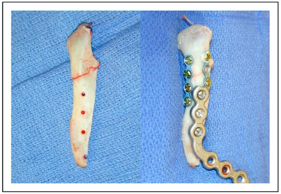 The surgical technique utilized involved an extraoral approach in all cases using either a submandibular or retromandibular incision. For osteochondroma patients, a preauricular approach was also used in some cases. Once the fracture or lesion is exposed, the mandibular ramus is pre-plated with a fixation plate positioned across the line of the planned sub-sigmoid osteotomy. The osteotomy is performed with care taken to protect the inferior alveolar nerve and the mandibular segments are explanted. With direct access, the fracture can be properly reduced and fixated or the osteochondroma can be resected extracorporeally on the surgical table. The segment can then be re-implanted as a free bone graft and fixated in place using the pre-drilled screw holes once the occlusion has been verified (Figure 2). Maxillomandibular fixation was utilized or not utilized depending on surgeon preference and the status of concurrent fractures. This was performed using elastics, wire fixation or both and for a variable length of time ranging from 1 week to 2 months. There was no documented consistency in the prescribing of post-operative medications or physical therapy exercises.