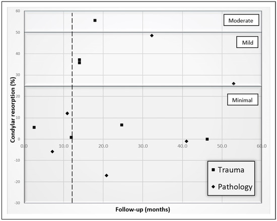 Figure 3. Scatter plot of patients in our series comparing the percent condylar resorption seen radiographically with the follow-up time in months. Sections of the grid have been differentially shaded to highlight minimal, mild and moderate ranges of resorption and each data point is marked to differentiate between trauma and pathology patients per the legend. A dotted line has been added to better delineate one year of follow-up.
