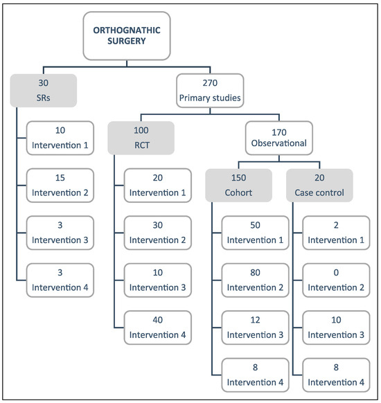 Results will be summarized in tabular formats, describing the included study characteristics and all the identified PICO questions. A flow diagram will be created to classify the included studies, by design at the first level and by intervention at the second level (Figure 1). An evidence matrix to link primary studies with their SRs will be created using the Epistemonikos platform to identify primary studies not included in the SRs.