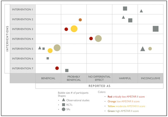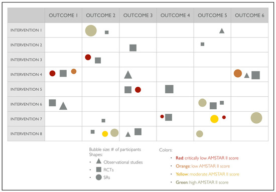 Evidence bubble maps will be created to graphically depict the available evidence (Figure 2). All interventions reviewed in the included studies will be listed in rows, and reported outcomes listed in columns, and symbols indicate the study design (circles for SRs, squares for RCTs, and triangles for observational studies). Bubble size will represent the number of primary studies included in the SRs or the number of participants included in the primary studies. A number positioned over each bubble will indicate the number of studies. Colors will indicate confidence in SR findings (based on the AMSTAR-2 evaluation). The primary studies included in the maps will be those not included in any of the identified SRs.