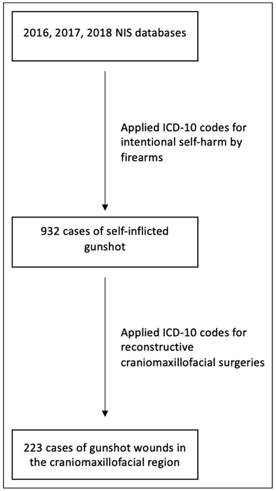 This lengthy screening process was completed by selecting all cases that entailed any form of craniomaxillofacial reconstructive surgery using the ICD-10 procedure codes. We used the ICD-10 diagnosis codes for intentional self-harm, specifically from handguns, shotguns, hunting rifles, and machine guns, to identify all patients who were hospitalized from firearm-assisted attempted suicide. Cases of intentional self-harm from air-guns and paintball guns were not included in the analysis. Amongst this filtered sample of patients, only injuries to the craniomaxillofacial region were selected for statistical analysis. Figure 1 illustrates a schematic diagram of the inclusion/exclusion criteria. Injuries to the neck were not included. Table 1 contains the ICD-10 codes that we utilized in the screening process.