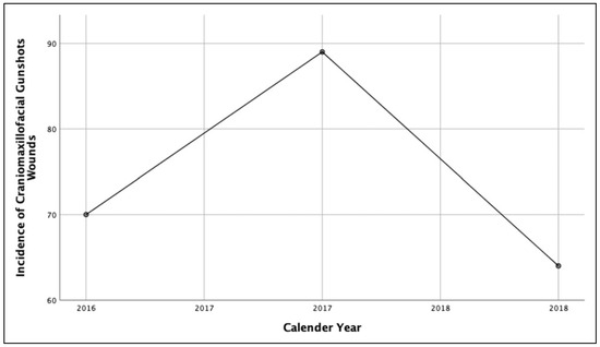 The incidence of maxillofacial trauma from attempted suicide with firearms across the 3 calendar years studied.