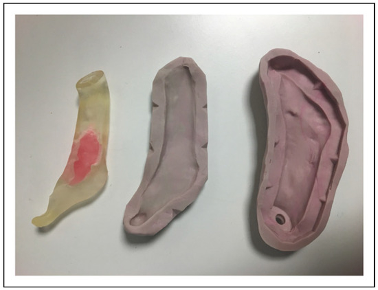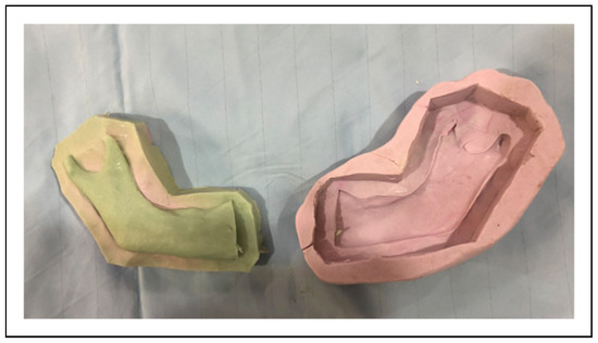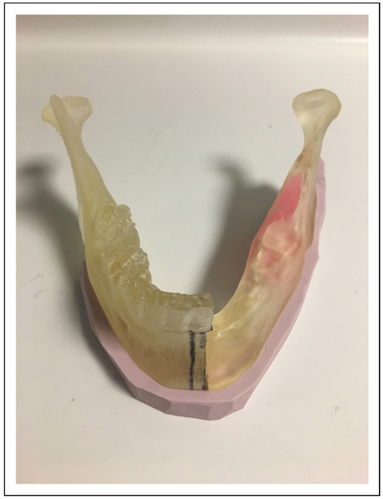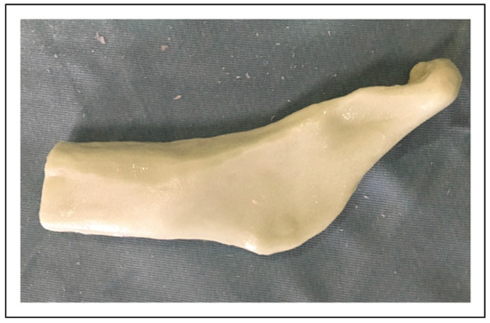 In case of a two-stage regime an intraoperative manufactory of a spacer was carried out. In this case, resection was conducted via an intraoral approach leaving the pre- auricular soft tissue untouched for later reconstructive surgery. Preoperatively, a sterilized silicon casting mould using a mirrored 3D-printed model of the mandible was produced (see Figure 1, Figure 2, Figure 3 and Figure 4). This facilitated the intraoperative manufacturing of a spacer using bone cement (BonOs®, Ostartis, Dieburg, Germany). The spacer was fixed using osteosynthesis.
