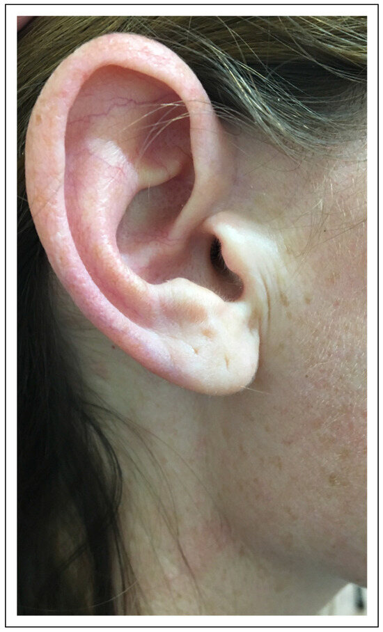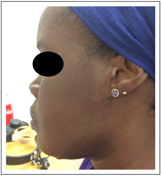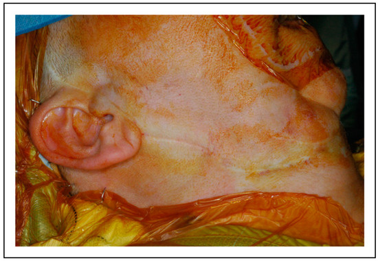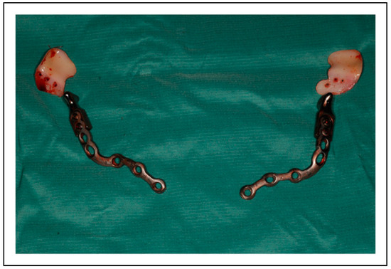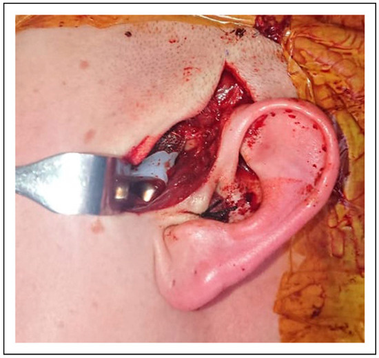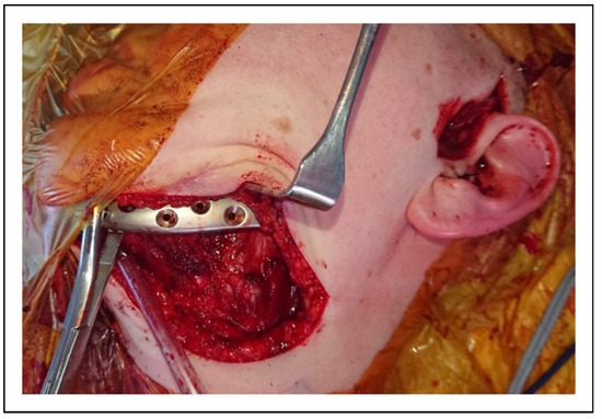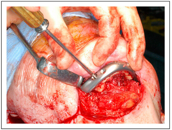 In both protocols, insertion of the TMJe was carried out via extraoral approach (see Figure 5, Figure 6, Figure 7 and Figure 8). The custom-made prostheses for extended TMJ replacement used for the patients were manufactured from either TMJ Concepts (www.tmjconcepts.com, Ventura, CA) or Zimmer Biomet (zimmerbiomet.com, Warsaw, IN).