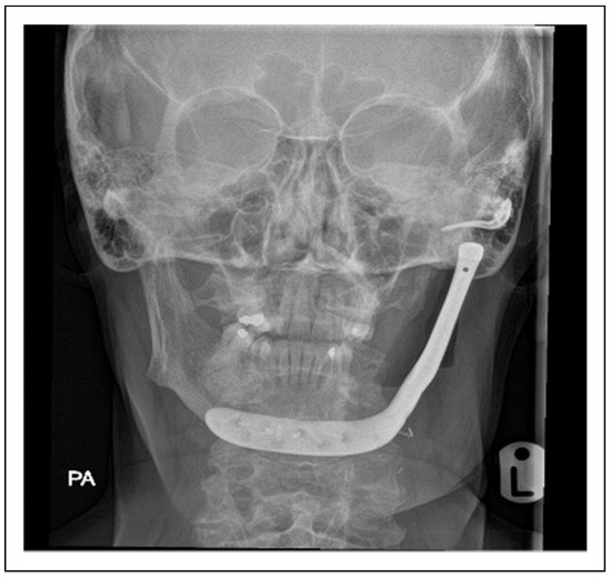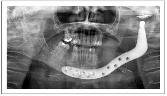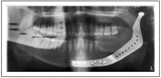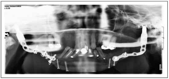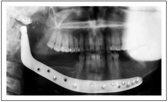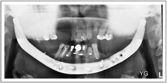 Patient 8. Postoperative Orthopantomogram of the custom-made device spanning the complete mandible and including both temporomandibular joints.