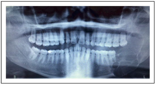 A forty-three-year-old female was treated for long-term chronic sclerosing osteomyelitis in the left mandible with wide excision (M3F0) from extraoral. No teeth were involved in the resection area (Figure 24). Therefore, a single-stage regime using an extraoral approach was chosen. Surgery achieved good mouth opening and good occlusion (Figure 25, Figure 26 and Figure 27).