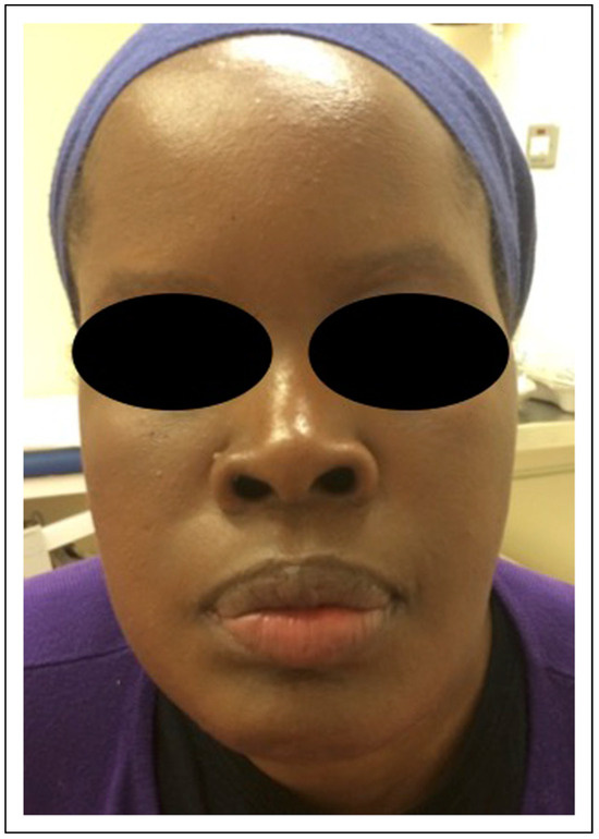Patient 1, the postoperative facial view shows good symmetry of the contour and facial soft tissues.