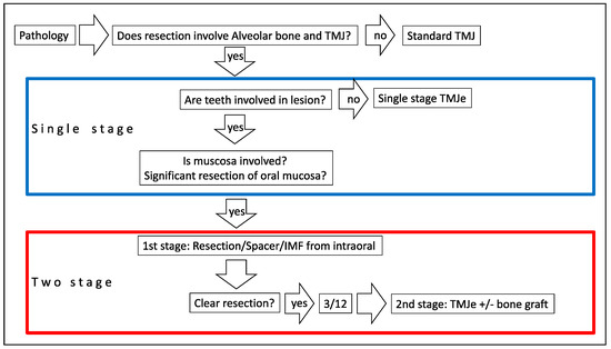 Pathologies involving teeth or periodontal tissues or mucosa, should be addressed in 2 stages. Initially, resection of the pathology including teeth and mucosa should be carried out from an intraoral approach. It may be combined with a small preauricular incision, if required. Using a temporary spacer following resection allows confirmation of the final histopathological diagnosis and resection margins. The anatomic space for the implant is maintained and allows function and height of the mandible.