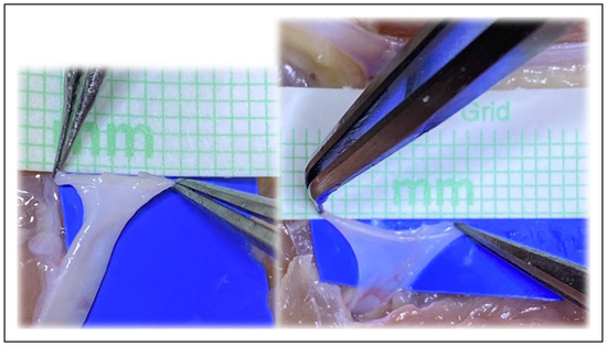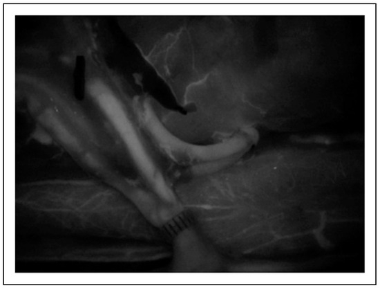 The in vitro poultry models of the hypothetical changes in vessel circumference are best demonstrated in the clinical figures. Figure 1 depicts the microvascular lab set up on the poultry specimens, with Figure 2 demonstrating the ideal size-matched vessel for a successful anastomosis. The common presentation of vessel bifurcation in Figure 3 can be advantageous if harnessed by either Akan's "open Y" method demonstrated in Figure 4 and Figure 5, or by simply transecting the vessel just below the bifurcation, but distal to the takeoff area where the vessel begins to diverge into the two branches, as in Figure 6. Utilizing the "open Y" technique, one must also account for the necessary trimming to ensure the vessel circumference is even without irregularities or intimal flaps, which can decrease the circumference achieved. The plasticity and increase in size of circumference is visible in both the artery and vein, as in Figure 7 and Figure 8, and cannot be represented mathematically. In vivo, this technique has been used at our institution with excellent outcomes, as seen through the microscope in Figure 9, and through SPY angiography in Figure 10.